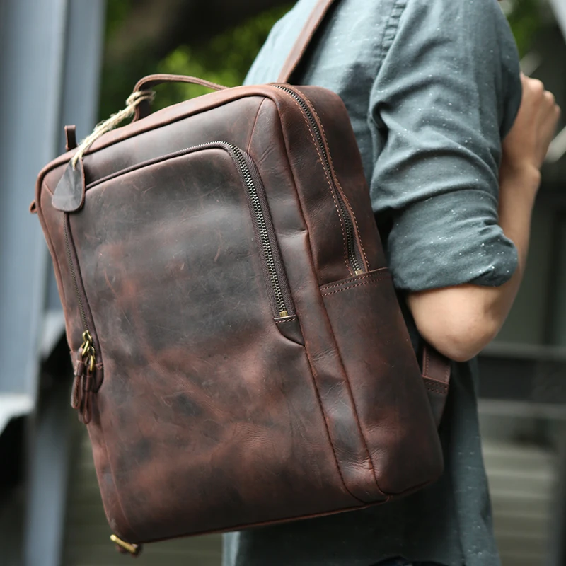 Vintage leather Men backpack computer bag men's first layer cowhide large capacity simple 15.6 inch