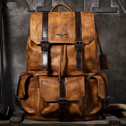 Large capacity Men travel bag mountaineering backpack handmade vegetable-tanned Leather drawstring